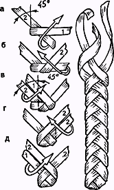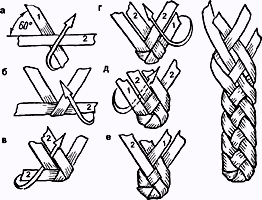 Плетенка-четырехконцовка (рис. 4) отличается от предыдущей большей шириной и более сложным рисунком плетения. Соломины располагают под углом 60° друг к другу (а). Соломину 1 огибают вокруг соломины 2. Затем один конец соломины 2 сгибают влево (б, в), а другой - вправо и просовывают под соседнюю соломину 1 (г). После этого конец соломины 1, расположенный справа, сгибают влево (д), а другой ее конец, расположенный слева, сгибают вправо и подсовывают под соломину 2. На этом цикл плетения замыкается и далее идет повторение плетения в той же последовательности.