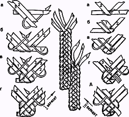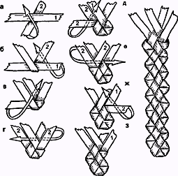 Для плетения плоской плетенки (рис. 11) берут четыре соломины, прочно связывают их концы. Две средние соломины являются как бы основой - ядром, которое оплетают двумя другими соломинами, находящимися по краям. Под средние соломины заводят сначала соломину 1, а затем соломину 2 (б, в). Соломину 1, в свою очередь, укладывают поверх ядра, притягивают сверху соломиной 2 (г) и загибают в противоположную сторону поверх ядра (д). Уже на другой стороне соломину 1 снова притягивают соломиной 2 (е). В той же последовательности ведется и остальное плетение (ж, з). Ширина отделочной плетенки зависит от количества соломин в ядре.