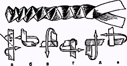 Начинают плести "зубатку" так же, как и простую четырехконцовку (а, б, в, г). И только на пятой стадии плетения возникает первое различие, когда образуется первый и начинает формироваться второй зубчик. Правый конец соломины 2 просовывают в плетение, огибают вокруг находящейся слева соломины 2 и выводят поверх соломины 1 (д, е). В свою очередь соломину 2, расположенную слева, просовывают в плетение и выводят справа (ж). В результате этих операций формируется второй зубчик. Приступая к формированию третьего зубчика, выведенную справа соломину 2 огибают вокруг соломины 1 (з). Все дальнейшие операции по формированию остальных зубчиков аналогичны предыдущим.