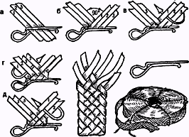 Рис. 1. Спиральное плетение: а - начало плетения; 6 - соединение жгута бечевкой; в - приспособление для контроля за толщиной жгута; г - окончание плетения; д - челнок для стягивания жгутов.