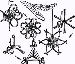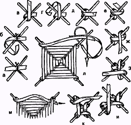Принцип плетения всех фигур одинаков, поэтому достаточно освоить приемы плетения наиболее простой из них - квадрата (рис. 9). Начинают плести с изготовления каркаса (а). Две соломины (палочки) располагают под прямым углом друг к другу и прочно связывают. Одновременно к крестовине привязывают ленту из соломы. Затем ею последовательно обвивают стойки крестовины, получая таким образом первую спираль квадрата (б - к). Так же выполняют второй, третий и остальные витки. Когда заканчивается соломина, новую вставляют тонкой частью (вершинкой) в комелек кончающейся соломины в тот момент, когда предстоит сделать очередной поворот вокруг стойки (л). Новую соломину огибают вокруг стойки, зажимая конец старой. Закончив плетение, конец оплетки заделывают под соломину, расположенную на противоположной стороне квадрата (л).