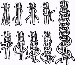Витую плетенку (рис. 12) закрепляют так же, как плоскую, и начинают плетение. Расположенную справа соломину 1 просовывают между соломиной 2 и двумя центральными соломинами (б). В свою очередь, соломиной 2 огибают конец соломины 1, выводят ее поверх центральных - ядра и просовывают в петлю, образованную справа соломиной 1 (в). Полученный узел затягивают покрепче и продолжают плетение. Соломины 1 и 2 меняются ролями: теперь уже соломину 2 просовывают между соломиной 1 и ядром, а соломиной 1 огибают конец соломины 2 и просовывают в петлю, образованную справа соломиной 2 (г). Полученный узел также затягивают покрепче. Все остальные узлы вяжутся в той же последовательности. В процессе плетения плетенка будет равномерно закручиваться по часовой стрелке. Кончающуюся боковую соломину наращивают, вставляя в очередную петлю конец новой соломины. Соединение будет более прочным, если некоторое время переплетать старую соломину вместе с новой. Соломины ядра могут быть не очень гибкими, в то время как боковые должны быть высокопластичными. Для проверки этого качества из партии замоченных соломин берут одну-две и завязывают простым узлом. Если узел получится округлым, без сколов и защепов, а солома вокруг него не треснула, то такой материал вполне годится для плетения.