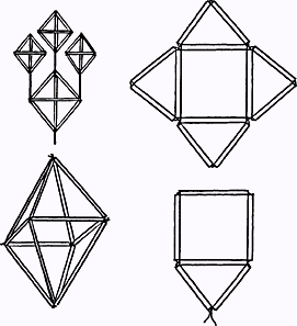 Такие конструкции собираются из отдельных пространственных ромбических элементов (рис. 16). Чтобы связать ромб, сначала нарезают 12 соломин одинаковой длины и толщины. Затем их нанизывают на нить с помощью толстой иглы. Четыре крайние соломины связывают в квадрат, у одной из сторон которого размещают две соломины так, чтобы получился треугольник. Такие треугольники выполняют на каждой стороне квадрата. Первую пару соломин треугольника перекручивают через основание к центру квадрата, вторую пару - от центра, третью - к центру, четвертую - от центра. Когда будет перекручена четвертая пара, оставшийся конец нитки связывают с другим концом. В результате должна получиться плоская фигура с квадратом в центре. Чтобы получить пространственную ромбическую фигуру, нужно поднять вверх второй и четвертый треугольники и связать их вместе, а первый и третий - отвести в противоположную сторону и тоже связать. Для того чтобы соломенные трубочки не разрезались нитью, их следует увлажнить перед сборкой ромбов. Для обеспечения жесткости конструкции в целом можно в основной несущий ромб вдеть гибкую проволоку, углы же остальных ромбов зафиксировать клеем ПВА.