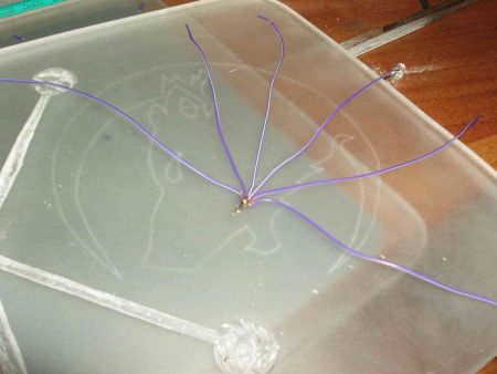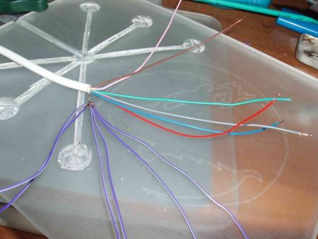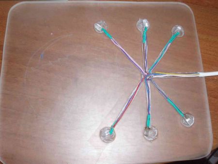 ![]() Теперь нужно разветвить землю с одного провода, на шесть проводов… Берём шесть проводков ( у меня каждый был примерно 13 сантиметров) и спаиваем их вместе, так как на фотке.