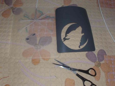![]() Теперь будем клеить прозрачную, шершавую самоклейку для стёкл, а вот её уже нужно клеить по всей поверхности коврика, так края и рисунок будут светиться ещё сильнее.