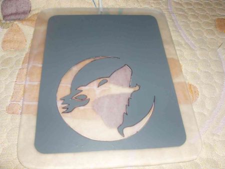 А теперь будем вырезать самоклейку, я взял самоклейку серого цвета… Отступаем от каждого края по 1.5 сантиметра, то есть от каждого края коврика до самоклейки 1.5 сантиметра то есть если размер коврика 17.5 x 21 см, то размер самоклейки будет 14.5 x 18 см. Рисунок я нашел в Интернете и в фотошопе подогнал его под размер, который мне нужен распечатал, перенес на самоклейку и аккуратно вырезал.