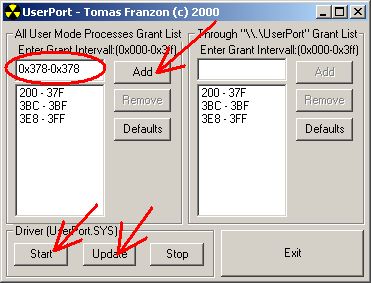 В левом окне нужно ввести “0x378-0x378” далее нажимаем “Add” затем "Start" и "Update".
