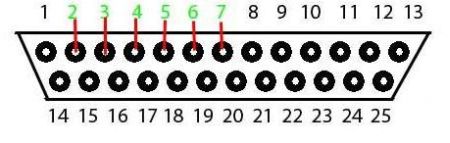 Берём наш кабель и LPT разъем, припаиваем 6 проводов на контакты от2 до7 как показано на схеме. (Зеленым цветом обозначены контакты на которые будем паять провода).