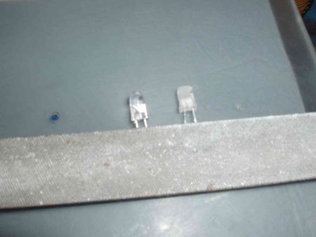 ![]() Сейчас нам понадобиться надфиль или напильник, ими мы будем стачивать наши светодиоды, чтобы уменьшить их в размере на пару миллиметров, так как у нас 5 миллиметровое оргстекло и 5 миллиметровые светодиоды. Все должно выглядеть как на фотке.