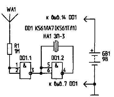 В цепи светодиода VD1 токоограничивающего резистора нет. так как микросхема DD1 (К561ЛА7) с этой функцией хорошо справляется сама. Если входные токи элемента D 1.1 позволяют, то убрав резистор R1 из схемы, изображенной на рис.2, мы получим устройство, реагирующее на изменение статического потенциала в окружающем пространстве. Для этого антенну WA1 делают длиной 50…100 см. используя любой провод. Теперь устройство будет реагировать на движение человеческого тела. Положив такое устройство в сумку, получим автономное охранное устройство, выдающее световые и звуковые сигналы, если с сумкой или около нее происходят какие-либо манипуляции.