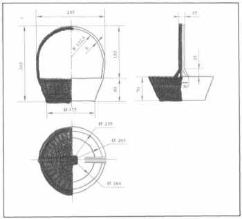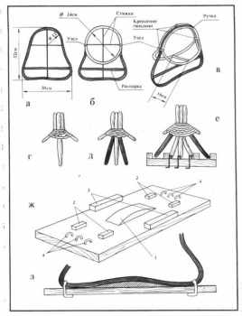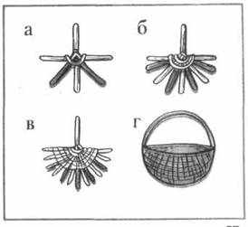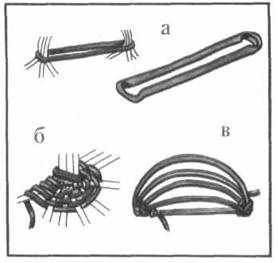 Так называют корзину, сплетенную на двух скрещенных обручах. Эти обручи должны быть одинаковыми, связывают их под прямым углом лентой либо прутом (рис. 49,а,б,в). После связки усиливают каркас, подставляя дополнительные палочки по одной или две в каждой четверти. Палочки оплетают в двух узлах. Затем подставляют еще палочки, опять оплетают их в узлах и т.д., пока не будет сооружен каркас (рис. 50,а,б,в). Плетение ведут поочередно с одной, потом с другой стороны к середине (рис. 50,г). Не правда ли, в итоге получается очень даже оригинальная корзиночка, не похожая ни на корзинку, сплетенную с донышка, ни на корзинку, сплетенную с обруча?
