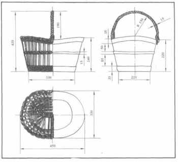 Для этой сумки требуются три обруча (один большой и два малых). Подбирают три прута для обручей диаметром 6 — 8 мм. Длина одного прута примерно ПО см, двух других — 80 см. Помимо этих прутьев, потребуются для боковых подставок четыре прута того же диаметра и длиной 50 см, а также 10 — 12 прутьев потоньше, длиною 40 см. На оплетку стенок понадобятся прутья толщиною не брлее 4 мм. Заготовки данных размеров необходимы для сумочки, длина которой составляет 30 см, ширина — 16 см и высота с ручкой 32 см.
