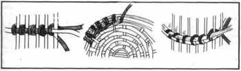 Ивовые тарелки для сухарей, печенья, для хлеба, фруктов плетут, как правило, из ивовых лент, суженных на шмоле (рис. 60). Плетут с донышка, кате круглую корзинку. Количество стояков в донышке должно быть нечетным. Оплетают донышко заданного размера концами лент. Затем подготавливают пластину (половина расщепленного пополам прута обычно диаметром 6 — 8 мм), прикладывают к краям дна и привязывают (рис. 61), вставляя нечетное количество боковых стояков. К стоякам с внешней стороны прикладывают другую пластину и обматывают лентой до необходимой высоты. Потом стенку опять обматывают лентой, соединяя концы (рис. 62). Остатки стояков обрезают.