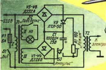 Как видно из принципиальной электрической схемы, (см. вкладку) сварочный апарат состоит из двух основных узлов: электронного реле на тринисторе V9 и мощного свароч­ного трансформатора Т2. К одному из выводов его низковольтной вторичной обмотки подключен свароч­ный электрод, второй вывод надежно соединяют с бо­лее массивной из двух свариваемых деталей. Сетевая обмотка трансформатора сварочного апарата подключена к сети через диодный мост V5—V8, в диагональ которого включен тринистор V9 электронного реле. Маломощный вспомогательный трансформатор Т1 питает цепь управ­ления тринистором (обмотка III) и лампу HI подсвет­ки места сварки (обмотка II).