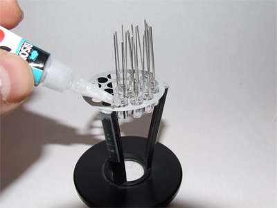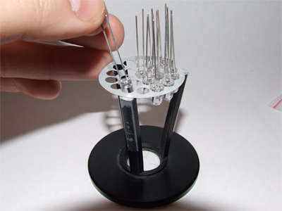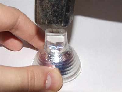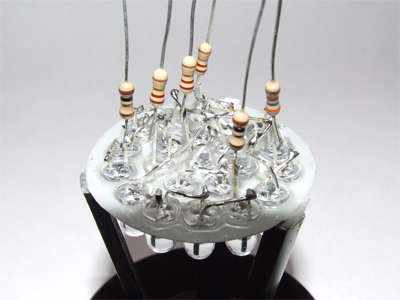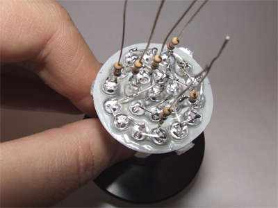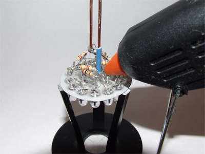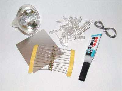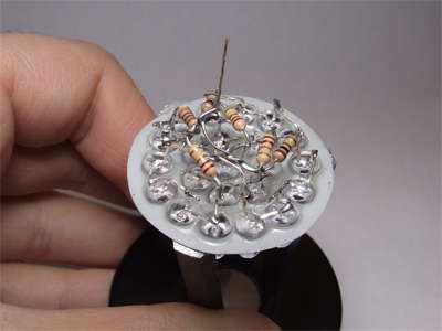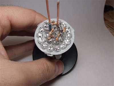 Фонарь на светодиодах своими рукамиСегодня мы научимся как сделать держатель светодиодов для установки их в фонарь или в любой осветитель (фары для автомобиля, лампочки для мебели, карманный фонарик и т.п.) ![]() На фото ниже приведены примеры изготовленных держателей для светодиодов. По этой технологии можно изготовить держатель любой формы для светодиодов различного размера и с любым количеством светодиодов. ![]() Для примера давайте переделаем гаголегоновую лампочку. ![]() Что нам потребуется для работы над держателем для светодиодов ![]() 1. Светоотражатель. 2. Светодиоды Светодиодов можно устанавливать - столько, сколько захотите. Где взять светодиоды ? Например в городе где я живу, светодиоды в большом ассортименте продаются на радиорынке. Они все собраны на стенде и можно оценить яркость их свечения. Когда будете приобретать светодиоды обязательно поинтересуйтесь куда подключать " + " и " -" , узнайте их напряжение и потребляемый ток. (это нам понадобится для дальнейших расчетов, об этом чуть позже) 3. Суперклей 4. Резисторы (поговорим чуть позже) 5. Припой и паяльник 6. Алюминиевую пластину (для изготовления пластины держателя, можно испльзовать любой прочный матерьял) 6. Терпение и свободное время Приступим. Для начала нам потребуется составить схему подключения светодиодов и подобрать номиналы сопротивлений (резисторов). Для этого очень удобно пользоваться он лайн сервисом http://led.linear1.org/led.wiz Он на английском языке поэтому ниже я перевожу названия полей которые надо заполнить Напряжение источника питания ( Source voltage) Напряжение питания светодиода (diode forward voltage) Ток потребляемый светодиодом (diode forward current (mA)) Количество устанавливаемых светодиодов (number of LEDs in your array) Ставим галочку на переключателе ( wiring diagram) Ставим галочку (help with resistor color codes) Нажимаем на кнопку и получаем схему с готовыми номиналами резисторов ![]() Идем дальше. Извлекаем из нашего светоотражателя старую лампу. Возьмите маленькую отвертку и очень акуратно расковыряете белую смолу которой фиксируется лампочка. ![]() Будьте предельно аккуратными, все детали очень хрупкие. ![]() ![]() Дальше прийдется набраться терпения и изготовить пластину для крепления светодиодов. Удобно использовать алюминиевую пластину, так матерьял мягкий и с ним легко работать Для изготовления пластины с отверстиями, удобно подготовить сначала макет на бумаге, с использованием графических программ на компьютере. Дальше распечатайте проект на бумагу и приклейте его на пластину из которой будет изготовляться держатель. Дальше просверлите отверстия в намеченных местах. ![]() ![]() Устанавливаем светодиоды Установите пластину на удобную подставку и начинайте размещать светодиды в просверленные отверствия, необходимо следить за размещением контактов светодиодов для правильной сборки электрической схемы. ![]() Лучьше сразу фиксировать светодиоды суперклеем. ![]() После установки всех светодиодов можно еще добавить клея, чтобы конструкция стала понадежнее. Приступаем к сборке электрической схемы. ![]() Желательно сильно не перегревать светодиоды. Если какой нибудьсветодиод выйдет из строя его будет трудно заменить, прийдется отрывать от клея. ![]() Когда все готово, припаиваем резисторы ![]() ![]() Будьте внимательны что бы не закоротить какие либо контакты. ![]() Припаиваем выводы нашей лампы Чтобы в дальнейшем не 