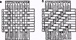Рис. 2. Прямое плоское плетение: а - полотняное, б - диагональное.