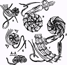 Рис. 1. Спиральное плетение: а - начало плетения; 6 - соединение жгута бечевкой; в - приспособление для контроля за толщиной жгута; г - окончание плетения; д - челнок для стягивания жгутов.