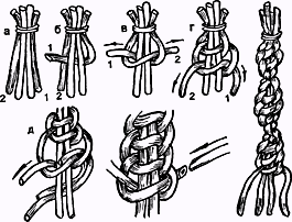 Рассмотрим процессы выполнения следующих плоских плетенок: трехконцовки, четырехконцовки, пятиконцовки, шестиконцовки, "зубатки".