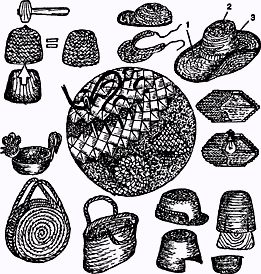 Уступом сшиваются плетенки для всевозможных головных уборов, сумок, абажуров и других изделий, показанных на рис. 14. Рассмотрим этот способ скрепления плетенок на примере изготовления шляпы. Для нее потребуется сплести 15-20 м "зубатки", которую перед сшиванием обязательно нужно увлажнить, тогда она хорошо будет выкладываться по форме и не расщепляться при прокалывании иглой. Сшивают по спирали. Шляпа, как известно, состоит из донышка 2 (рис. 14), тульи 3 и полей 1. Сшивать начинают с донышка. Вокруг конца "зубатки", отогнутого на 5 см, выкладывают по овалу витки ленты плетенки. На закругленных участках слегка растягивают ее по внешней стороне. Каждый виток накладывают на предыдущий на 1/3 ширины ленты и пришивают. Шить следует нитками под цвет соломки, делая стежки не более 2-3 мм и стараясь размещать их на зубчиках. После того как будет сшито 8-10 витков (размер шляпы 56-58), очередной виток отгибают от прошивки вниз, а последующие витки выкладывают по его периметру и выстрачивают тулью высотой 6-7 см. Чтобы вывести из цилиндра тульи плоские поля шляпы, внешний край десятого витка припускают в длину и отгибают вверх. Для полей достаточно сшить 8 витков. Конец "зубатки" подшивают под предыдущий виток. В процессе сшивания необходимо помнить, что если плетенку припускать - форма изделия увеличится, если натягивать - уменьшится.