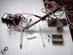 (Существуют и другие способы по созданию аналогов неонок) ![]() Итак, приступим. Мне понадобились следующие вещи: - яркие различные светодиоды, немного проводов, различный инструмент и пару исписанных гелиевых ручек.
