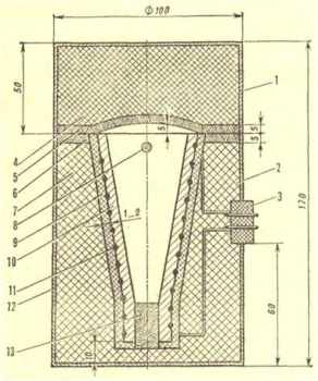 1 — крышка, 2 — корпус, 3 — штепсельная коробка, 4, 7 — асбестовая крошка, 5, 6 — глиняная облицовка, 8 — заделка крепежного отверстия, 9 — кварцевая теплоизоляционная ткань, 10 — корпус нагревательного элемента, 11 — нихромовый нагреватель, 12 — стенка корпуса, 13 — заделка цоколя. ![]() Рис. 2. Нагревательный элемент — тигель мини-печи: