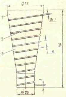 Затем в цоколе надо продолжить тонким надфилем или ножовкой по металлу винтовую нарезку: это позволит увеличить прогрев относительно массивной цокольной части, а значит, получить более равномерное поле температур по всему тиглю. Нагревателем будет служить проволока из нихрома 1 мм, уложенная в канавку. Изготовленный узел плотно обмотайте 1-2 слоями кварцевой ткани, имеющей низкую теплопроводность, или стеклоткани, а концы проволоки выведите наружу.