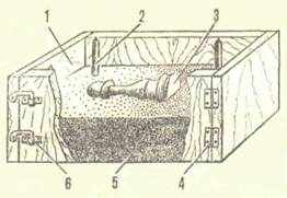 1 — опока, 2 — фиксирующий штырь, 3 — модель, 4 — петля стенок опоки, 5 — подмодельная доска, 6 — запорный крючок. ![]() Рис. 4. Готовая полуформа: