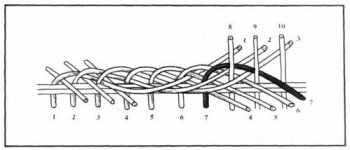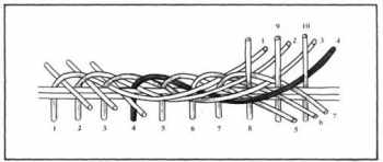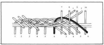 начинаем поочередное плетение, а именно: стояком 5 огибаем сзади стояки 6 и 7.