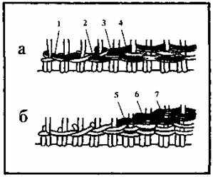 Хорошо смотрится плетение рядами (рис. 19, 38). Рассмотрим этот вид плетения подробнее (рис. 38). Прут 1 комель-ковым концом вставляют внутрь корзины между двумя стояками и заплетают по периметру до конца. Прут 2 заостренным комельковым концом вставляют под прут 1, отступя на стояк вправо. Прут 3 вставляют под прут 2 тоже с отступлением вправо на один стояк. Точно так же вплетают прут 4 (рис. 38,а). Следующие прутья, начиная с 5, заостренным комельковым концом вставляют уже в заплетенную часть стенки у очередного стояка справа (рис. 38,6). Обойдя прутьями один раз вокруг корзины, получим первый ряд плетения. Также заплетают втс-рой и третий ряды. После каждого ряда делают осадку изером или просто шилом. После каждого ряда можно повторить веревочку, что сделает корзинку более жесткой и прочной. Заметим, что на рис. 38 плетение показано с внешней стороны корзинки. Все концы начала плетения «смотрят» внутрь корзины. Для плетения дна корзины оставшиеся свободные концы стояков смачивают водой, попарно группируют по направлению навстречу друг другу, загибают (один с одной стороны, другой с противоположной). У стояков оставляют припуск в 4 см, его застругивают и вставляют в плетение около парного стояка. Не использованную для получения поперечин часть стояка впоследствии вплетают в дно корзины. Для плетения дна подбирают гибкие прутья по длине не короче одного хода заплетки. Заплетают дно, начиная от края к середине.