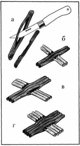 В корзинах, сплетенных с донышка, основой является последнее. С него начинают вести плетение. Если нам необходимо дно круглое, 10 для него берут 4,6,8 палочек. По диаметру эти палочки подбирают такими, чтобы они примерно в 20 — 25 раз были меньше диаметра будущей круглой корзины. По длине палочки делают больше диаметра корзины на 4 — 6 см. В половине палочек острием ножа расщепляют середину. Во второй половине середину на полтолщины палочки состругивают, а по длине соструг делают равным сумме 2,3,4 диаметров палочек (рис. 39,а). В результате мы получим крестовины, у которых 8,12 и 16 концов (рис. 39,б,в,г). Теперь берем тонкий прутик (по диаметру он тоньше палочек раза в 3) и стягиваем им крестовину. Середину крестовины оплетают веревочкой в два прута так, чтобы после разведения концов палочек плотность середки не нарушалась (рис. 40,а). При количестве палочек 4 и 8 концы разводят попарно. Один-