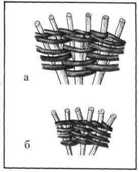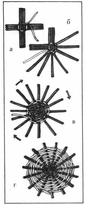 два ряда эти концы заплетают веревочкой в два прута, потом плетут одним прутом. Если у нас 6 палочек, то концы разводят по одному, также заплетая веревочкой в два прута (рис. 40,6). Через два-три ряда вставляют дополнительные палочки (рис. 40,в) — лучше нечетное количество: 3;5 и т.д. Понятно, что необходимо соблюдать одинаковые углы между палочками. Плетение теперь ведем одним прутом. Желательно, чтобы диаметр прутиков по мере плетения от середины к краям увеличивался. Заканчивают плетение веревочкой двумя прутьями (рис.40, г). В случае когда заданный диаметр дна большой, количество дополнительных палочек также увеличивается. Их можно подставлять дважды, то есть тогда, когда расстояние между палочками будет равно сумме 8 — 10 диаметров последних. Их можно вставлять как с одной стороны, так и с двух сторон стояка (рис. 41,а,б).