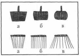 Хозяйственные корзины, сплетенные с обруча. Как показывает название, для этих корзин в первую очередь изготавливают обруч из ореховой или ивовой палки. Добавим, что подобные корзины, сплетенные с обруча, еще называют монастырскими (имеются в виду корзины преимущественно овальной формы). Итак, после изготовления обруча подготавливают прутья для стояков и для за-плетки стенок. Рабочий материал готовим в зависимости от предполагаемого размера корзинки. Заметим, что обычно на за-плетку прутьев идет раза в три больше, чем для стояков. Обруч лучше всего приготовить сразу во время заготовки прутьев. Палку необходимой длины сгибают в овал или круг. Концы палки застругивают на клин и скрепляют либо проволокой, либо бечевкой, либо тонкими гвоздиками. На обруче размечаем места стояков. Наиболее оптимальное расстояние между стояками равно пятикратно увеличенному диаметру самого стояка, то есть 5d. Стояки с одной стороны остругиваем вполовину по толщине на расстоянии примерно 15d. Это расстояние должно нам позволить закрепить стояк на обруче при за-плетке соседним стояком, а для большей прочности даже двумя (рис. 36,а). При креплении стояков на обруче заструганые концы первых нужно замочить, чтобы при изгибах не поломать. Крепят стояки следующим образом. Кладут обруч ребром на колени. Правой рукой берут стояк, прикладывают его самым началом струганой части к обручу с внешней стороны. Затем, прижимая стояк к обручу левой рукой, правой дважды обвивают струганой частью стояка обруч (по направлению вправо от стояка). Свободный конец струганой части загибаем влево, обвивая сам стояк с наружной стороны, и выводим этот свободный конец на обруч с внутренней стороны (рис. 36,6). Потом мы аналогично крепим второй стояк, одновременно плотно прижимая им при об-вивке обруча конец струганой части первого стояка (рис. 36,в) и т.д. Конец последнего стояка вставляют под обивку первого. Можно крепить стояки и одним загибом вокруг Обручевой палки (рис. 36,г). Стояки на обруче крепят с учетом формы будущей корзины: конусной, цилиндрической, бочкообразной (рис. 37). Теперь можно начать заплетать стенки корзины. Для этого обруч стояками вверх кладут на стол. Так как стояки при плетении как бы стремятся сблизиться, их все время нужно выправлять. Для плетения стенок прутья должны быть в длину не менее 3/4 периметра корзины, по толщине примерно 0,5 — 0,8 диаметра стояков. Перед плетением прутья замачивают в воде, особенно если они очищены от коры. Плетут обычно способом простого плетения или одним концом. Но в начале для закрепления стояков плетут веревочку в три прута. Веревочка зафиксирует стояки, поможет удержать их в нужном нам направлении.