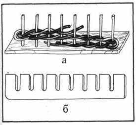 Существует еще один способ сплетения овального дна корзины без расщепления коротких палочек. Для этого способа нам сначала необходимо сделать вспомогательное приспособление. Берут кусок толстой фанеры (8 — 10 мм толщиной) или широкую гладко оструганную доску. Сверлят в них три-четыре ряда отверстий под короткие палочки-стояки. Диаметр отверстий выбирают под наиболее ходовой диаметр прутьев-стояков: в первом ряду делают отверстия диаметром 7 — 8 мм (расстояние между отверстиями равно сумме 5 диаметров последних, то есть 35 — 40 мм); во втором ряду сверлят отверстия диаметром 5 — 6 мм (расстояние между последними составляет соответственно 25 — 30 мм); в третьем ряду — отверстия диаметром 3 — 4 мм (расстояние между отверстиями равно 15 — 20 мм); в четвертом ряду — отверстия 2 — 2,5 мм (расстояние между ними — 12 — 10 мм). Подбирают 5 — 7 палочек-стояков, вставляют их плотно (но так, чтобы потом можно было вытащить) в нужный нам ряд отверстий. Далее берем 4 — 6 длинных прутьев, по диаметру соответствующих толщине коротких палочек. Заметим, что и короткие и длинные палочки должны быть длиннее заданных длины и ширины дна корзины на 40 — 50 мм. Затем палочками переплетаем короткие (рис. 43,а). Сплетенную сердцевину дна осторожно извлекаем из приспособления и далее оплетаем тонким прутом, как и в первом варианте, сначала веревочкой в два прута, а потом в один прут (рис. 43,6). Для сплетения прямоугольного дна корзины используют то же самое приспособление, что и для плетения овального дна. Начинают плетение веревочкой в два прута. Причем плетение начинают с середины тонкими концами прутьев (рис. 44,а). Потом плетение ведут одним прутом и заканчивают опять веревочкой в два прута. Все концы прутьев стараются выводить на какую-либо одну сторону. При плетении следят, чтобы стояки сохраняли параллельность по отношению друг к другу- В этом может оказать помощь приспособление-гребешок (рис. 44,6). После завершения подготовки дна корзины все концы стояков обрезают заподлицо с плетением. К стоякам дополнительно в зависимости от размеров корзины подставляют 1 — 2 стояка. Их загибают вверх, связывая концы. Длина стояков учитывает высоту корзины плюс расстояние, необходимое на заплетку корзиночного края. Для того чтобы наше изделие при плетении не повело вкривь и вкось, используют болванку необходимой формы высотой 4 — 5 см. Под дно корзины ставят подставку, представляющую собой кусок доски или толстой фанеры. К этой подставке дно корзины крепят при помощи шурупов, а сверху на дно кладут болванку. Стояки вначале сплетают 2 — 3 веревочками в три прута, потом плетение ведут одним прутом, как и при изготовлении корзины с обруча. Завершают плетение опять двумя-тремя веревочками в три прута, а затем делают косичку в 4 прута. Ручки к корзине изготавливают так же, как и у корзины с обруча. Заметим, что корзины, сплетенные с обруча, более прочны. Ну а по принципу плетения корзины с донышка выплетают многие и другие изделия: всевозможные сухарницы, вазочки и т.п.