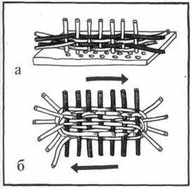 Для того чтобы сделать овальное дно корзины, берут 3 — 4 длинные ивовые палочки и 7 — 9 коротких. Число коротких палочек прямо зависит от заданных размеров корзины. Чем больше корзина, тем больше и коротких палочек. Так же, как и при изготовлении круглого дна, короткие палочки посередине расщепляют, а на длинных палочках делают соструг под толщину коротких палочек. Расстояние между короткими палочками зависит от толщины последних и примерно равно сумме 5 их диаметров (рис. 42,а). По краям короткие палочки устанавливают по две вместе. Вначале при помощи плетения веревочки в два тонких прута за два прохода закрепляют короткие палочки. Потом, разводя концы длинных палочек, плетение ведут по периметру (рис. 41,6).