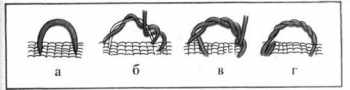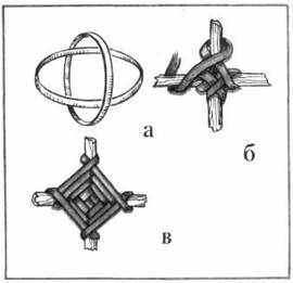 Для изготовления дна полукруглой корзины берут две палочки, равные по длине, складывают их вместе противоположными концами. Перпендикулярно к середине этих палочек прибивают третью поперечную, которая по длине вдвое меньше (рис. 45,а). Теперь палочки сплетают двумя рядами веревочки в два прута. Затем плетут одним прутом, попутно вставляя с каждой стороны поперечной палочки по два стояка. В зависимости от размеров изделия донышко укрепляют новыми стояками. Заканчивают дно одним-двумя рядами веревочки в два прута. Как сплести донышко угловой корзины, видно из рис. 45,6. По окончании плетения донышка в нем укрепляют дополнительно стояки, загибают их вверх и стенки плетут так же, как и у других корзинок (например прямоугольной). То есть установленные стояки стенок заплетают двойной веревочкой в три прута. Углы корзинок укрепляют палками, как у прямоугольной дорожной корзины. Для фиксации стояков в нужном положении используют шаблон. Заканчивают плетение стенок корзин двойной веревочкой в четыре прута.