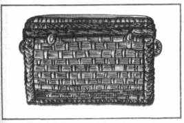 Дорожные корзины начинают делать с донышка. Для его основы подбирают стояки, количество и размеры которых напрямую зависят от размеров самой корзины. Заметим, что по длине стояки должны быть на 4 — 5 см длиннее корзины. Стояки остругивают с двух сторон и вставляют в отверстия нашего приспособления, изготовленного из доски. По краям стояки должны быть парными. А далее дно выплетают так же, как и у прямоугольной корзины (рис. 44). То есть плетение начинают веревочкой в два прута, потом плетут одним прутом, через каждые 5 — 7 см изером или колотушкой сколачивая само плетение. Заканчивают плести донышко опять веревочкой в два прута. Кстати, и в целом дорожные корзины выплетают по принципу прямоугольных. Затем в донышко вставляют стояки, которые загибают вверх. Для удобства заплетки стояков стенок из толстого прута делают прямоугольную раму. Ее вставляют в середину боковых стояков, привязывая к последним бечевкой. Далее начинают плести стенки, конечно, с веревочки в три прута, затем через два ряда переходят на простое плетение или послойное в шашечку. Через 12 — 15 см переходят опять на веревочку в 3 прута, которую плетут с двух сторон корзины (начинают вершинными концами, в середине соединяют комлевыми концами). Выше этой веревочки плетут уже квадратами. Как только будет достигнута нужная нам высота, переходят на завершающее плетение веревочкой в пять прутьев. Ее так же, как и предыдущую веревочку в три прута, начинают вершинными концами с середины торцовой стенки. В середине боковой стороны соединяют комлевыми концами и после соединения завершают вершинными концами. Плетение веревочки в 5 прутьев ведут тоже с двух сторон. Доходя до угла, последний огибают, как показано на рис. 46, укрепляя в углах по одному стояку-пруту. Затем все стояки смачивают и сгибают к середине. В образовавшейся суживающейся части выплетают стенку 6 — 8 см высотою. Завершают плетение стенок как обычно загибкой в три или четыре пары прутьев. Затем переходят к плетению крышек дорожных корзин.