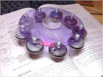 4. Изготовление мембраны: надо взять ДВД болванку - с торца если на неё посмотреть, то можно увидеть, что она двухслойная - тем же канц. ножом надо расщепить её - вогнать нож между слоями. Рекомендую TDK или Verbatim. При этом возникает еще один подвох - между слоями есть нестираемый блестящий слой и на какой половинку диска он решит остаться - загадка природы, поэтому если когда нож вошел между дисками и вы смотрите на него с сиреневой стороны ("зеркальце") и вы видите лезвие от этого места, вводите нож дальше и как-бы разрезайте им слой между дисками - по окружности, если же нож скрыт под блестящим слоем - попробуйте расщепить с другой стороны.