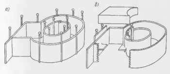 Изготовление модели. Модель можно изготовить из свинцовой полосы. Во многих случаях рациональнее отлить заготовку из свинца в простейшей листовой форме и затем довести ее до нужной конфигурации и размеров. Из тонкой латунной полосы сгибают контур формы (рис. 2, а), слегка вдавливают его в плоский кусок древесного угля и закрепляют булавками. Расплавленный свинец заливают в форму и получают заготовку модели. При желании в касте заготовки можно сделать отверстие. Для этого в месте каста в контурной полосе формы делают прямоугольные надрезы и, отогнув лапки, устанавливают на них стержень (рис. 2, б) - Для предотвращения утечки свинца из формы позади образовавшихся окон устанавливают латунные полоски. Этим методом можно изготавливать модели различной формы и конфигурации.