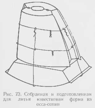Изготовление формы. Большую раковину осса-сепии разрезают на три части. Обе верхние части предназначены для шинки, нижняя — для каста. Все три части с внутренней стороны обрабатывают по плоскости. В обе боковые верхние части вдавливают модель шинки кольца, до заплечиков каста, одновременно с маркировочными уголками. После этого части формы разъединяют, вынимают модель, собирают полуформы вместе и прифовывают нижнюю поверхность частей форм, пока не покажется отпечаток шинки. Модель снова вставляют в форму и вдавливают каст кольца в нижнюю часть заготовки формы до полного совпадения всех трех частей формы. Одновременно с этим вдавливают нижние маркировочные уголки. После этого модель снова вынимают и прорезают литниковый и вентиляционный каналы. Затем форму собирают так, как показано на рис. 3.