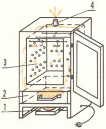 1 — электроплитка; 2 — поддон с древесными опилками; 3 — коптильная камера; 4 — отверстие для выхода дыма