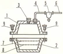 После этого автомобильным насосом накачивают в автоклав воздух до давления 1 атм и визуально (с помощью мыльной воды), а также на слух проверяют герметичность соединения.