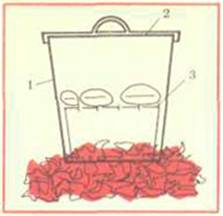 Коптильня для горячего копчения рыбы (рис. 17) — оборудованное ведро-бадья 1. Ведро имеет крышку 2, которая его плотно закрывает. Внутри ведра вставлена решетка 3 с ножками, фиксирующими решетку на определенном уровне. Можно сделать так, чтобы была двойная решетка (для повышения производительности).