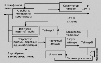 По истечении времени таймер отключает телефон от линии в том случае, если Вы не подали тональный сигнал в линию, если тональный вызов будет правильным, частотный детектор его опознает и запустит таймер В. Таймер В выполняет двойную функцию: включает питание на усилитель и блокирует таймер А, не давая ему отключаться.