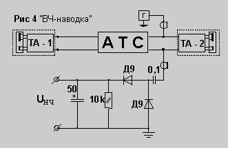 Прослушивание через микрофон телефонного аппарата ТА. Этот способ не является синонимам непосредственного подключения к линии, это гораздо сложнее. Микрофон является частью электронной схемы ТА; он либо соединен с линией (через отдельные элементы схемы) при разговоре, либо отключен от линии, когда ТА находится в готовности к приёму вызова (трубка находится на аппарате). На первый взгляд, когда трубка лежит на аппарате и нет никакой возможности использовать микрофон в качестве источника съема информации. Но это только на первый взгляд ... На рис 4 приведена схема прослушивания с использованием ВЧ – наводки относительна общего корпуса (в качестве которого лучше использовать землю, трубы отопления и т. д.) на один провод подайте ВЧ колебания 150 Гц выше. Через элементы схемы ТА, даже если трубка лежит на аппарате ВЧ колебание поступает на микрофон и далее уже промодулированное в линию.