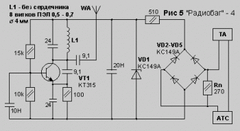 Прослушивание с помощью радио-микрофона с питанием от телефонной линии. На рис 5 приведена такая схема.