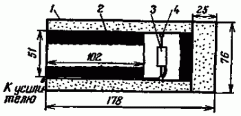 Схематически устройство такого микрофона показано на рис.1. Основная его деталь - электромагнитный капсюль (3), размещенный в цилиндрическом футляре (1). Капсюль с обеих сторон залит эпоксидной смолой. Сторона капсюли, обращенная к открытому отверстию футляра, имеет "чувствительное окно" небольших размеров, обеспечивающее звуковым колебаниям доступ к мембране. С помощью трех растяжек капсюль подвешен на проволочном кольце (4), которое расположено в тыльной стороне футляра. Для уменьшения отражения от стенок внутренность футляра покрыта слоем фетра или войлока (2) толщиной около 12 мм.