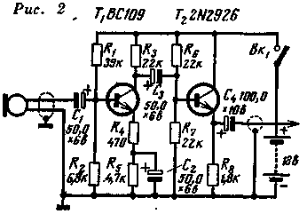 Примечание редакции. В качестве микрофонного капсюля можно использовать капсюль ДЭМШ. Для первого каскада можно взять транзистор МП111А, для второго - МП38А.