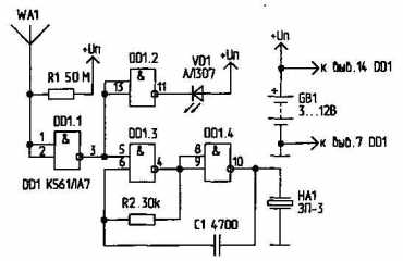 В цепи светодиода VD1 токоограничивающего резистора нет. так как микросхема DD1 (К561ЛА7) с этой функцией хорошо справляется сама. Если входные токи элемента D 1.1 позволяют, то убрав резистор R1 из схемы, изображенной на рис.2, мы получим устройство, реагирующее на изменение статического потенциала в окружающем пространстве. Для этого антенну WA1 делают длиной 50…100 см. используя любой провод. Теперь устройство будет реагировать на движение человеческого тела. Положив такое устройство в сумку, получим автономное охранное устройство, выдающее световые и звуковые сигналы, если с сумкой или около нее происходят какие-либо манипуляции.