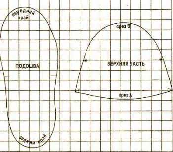 Детали выкройки (см. чертеж) увеличить с помощью растра. В оригинале 1 клеточка = 2х2 см. Из хлопчатобумажной ткани: подошва — 2 детали и 2 детали в зеркальном отображении, верхняя часть — 4 детали; из флизелина: подошва — 2 детали и 2 детали в зеркальном отображении; из волюненфлиза: подошва —1 деталь и 1 деталь в зеркальном отображении, верхняя часть —2 детали. Все детали выкраивать без припусков на швы.