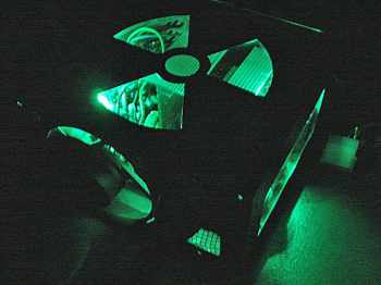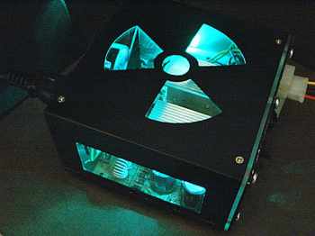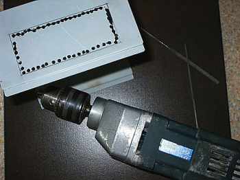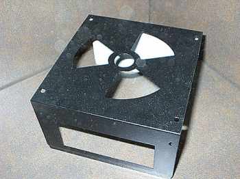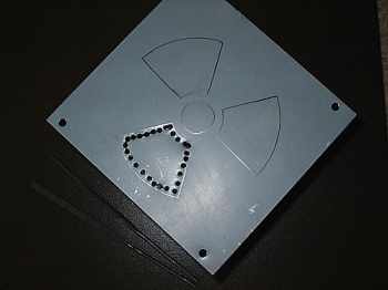 Разбираем БП, а то ничего не получится. Снимаем крышку, это первый подопытный. Рисуем на верху знак радиации, предварительно нарисовав его (в photoshop’e) и распечатав, а на боковой стенке прямоугольное окошко. Теперь дрелью начинаем сверлить по внутренней стороне рисунка. Вот так…